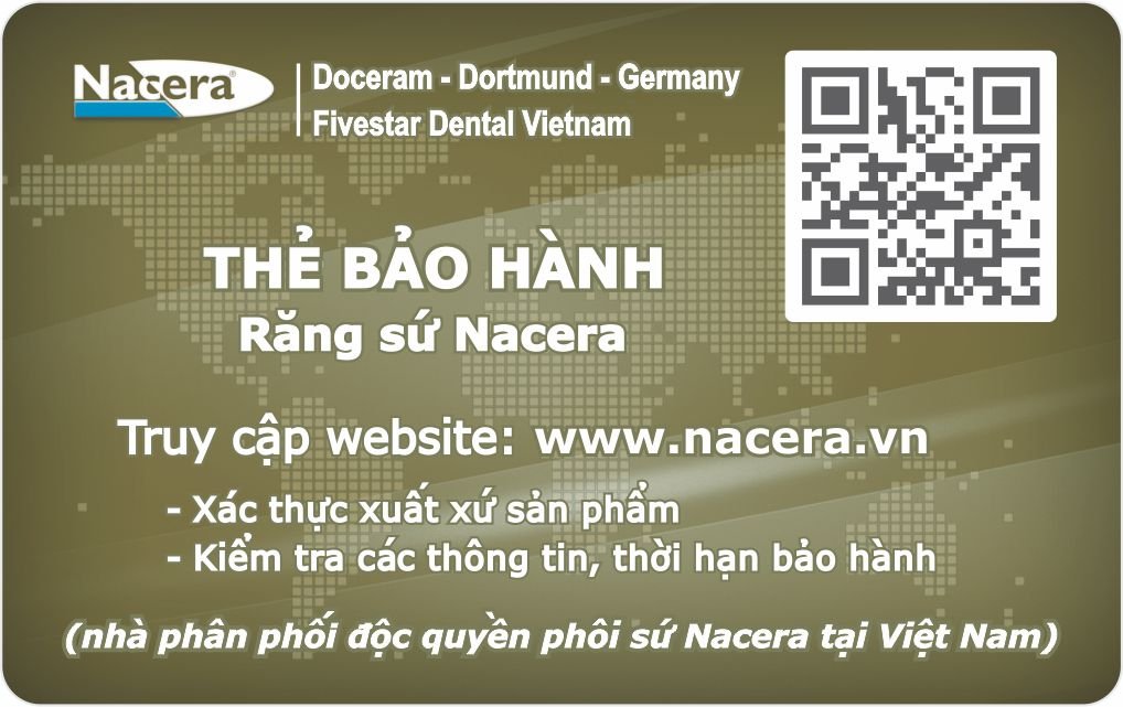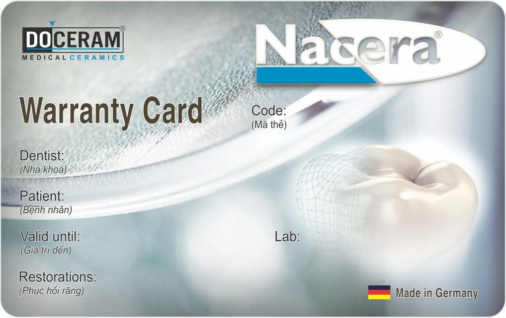Khi phòng khám nha khoa nhận được đơn hàng của chúng tôi, sẽ nhận kèm một thẻ bảo hành răng sứ Nacera chính hãng như hình. Trong thẻ sẽ có cách hướng dẫn cụ thể để bệnh nhân có thể tra cứu thông tin bảo hành trên Website chính hãng. Quý khách vui lòng truy cập website: www.nacera.vn để tra cứu thông tin bảo hành.
