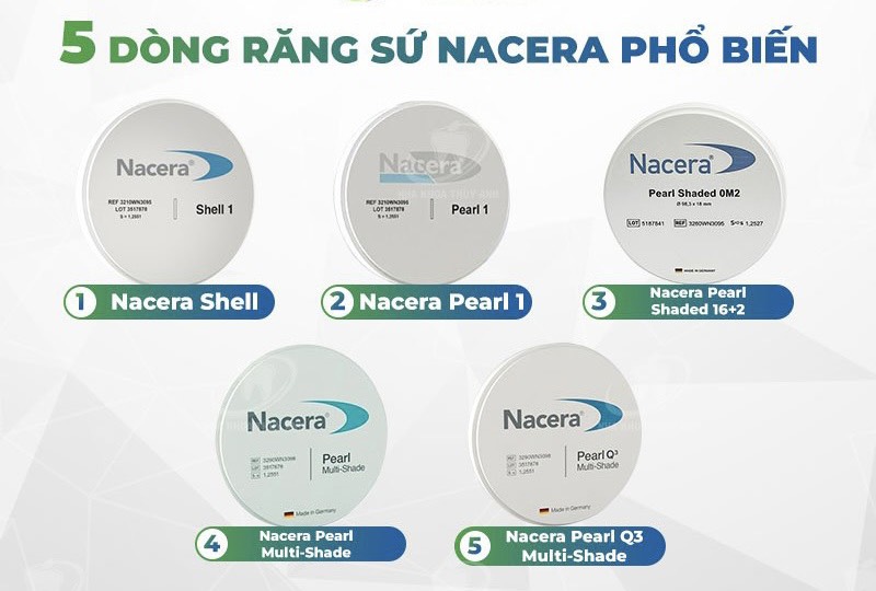 Công ty DOCERAM GmbH đã phát triển răng sứ Nacera gồm 5 loại, mỗi loại răng sẽ có những đặc điểm riêng: